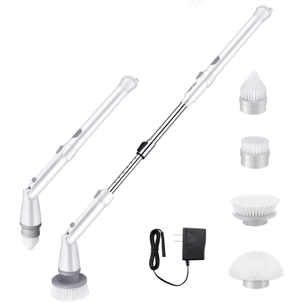 Electric Spin Scrubber with Upgraded Handle, 360 Cordless Bathroom Scrubber with 4 Replaceable Shower Scrubber Brush Heads, 1 Extension Arm and Adapter for Tub, Tile, Floor, Wall and Kitchen